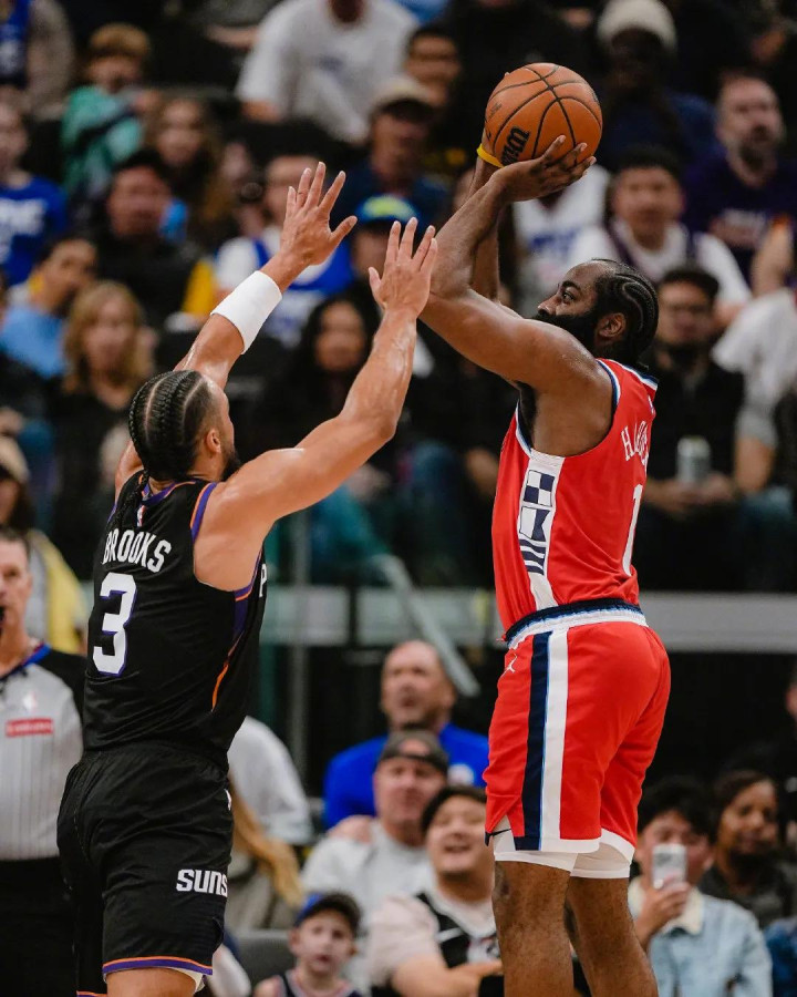 上一场大比分输给太阳之后,快船今天调整了轮换,保罗和博格丹被DNP,但球队依然没有什么起色。上半场全队投出了惊人的14中1的三分,只有哈登投进一个。太阳足足比快船上半场多出手10次,分差在几个回合内就被拉开。
